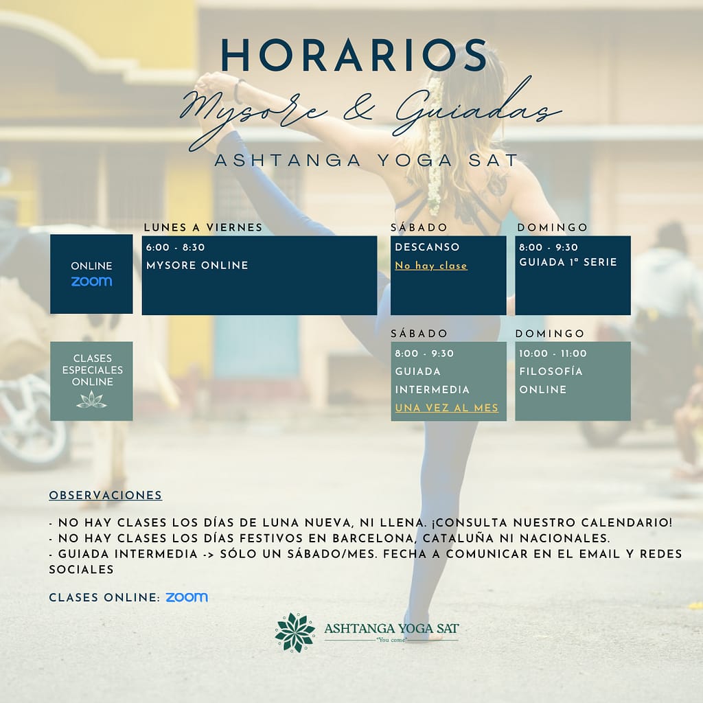 Ofrecemos clases de Ashtanga Yoga tradicional online en Zoom (de lunes a domingo. Sábado es nuestro día de descanso, excepto si hay alguna clase especial). Consulta nuestro calendario.